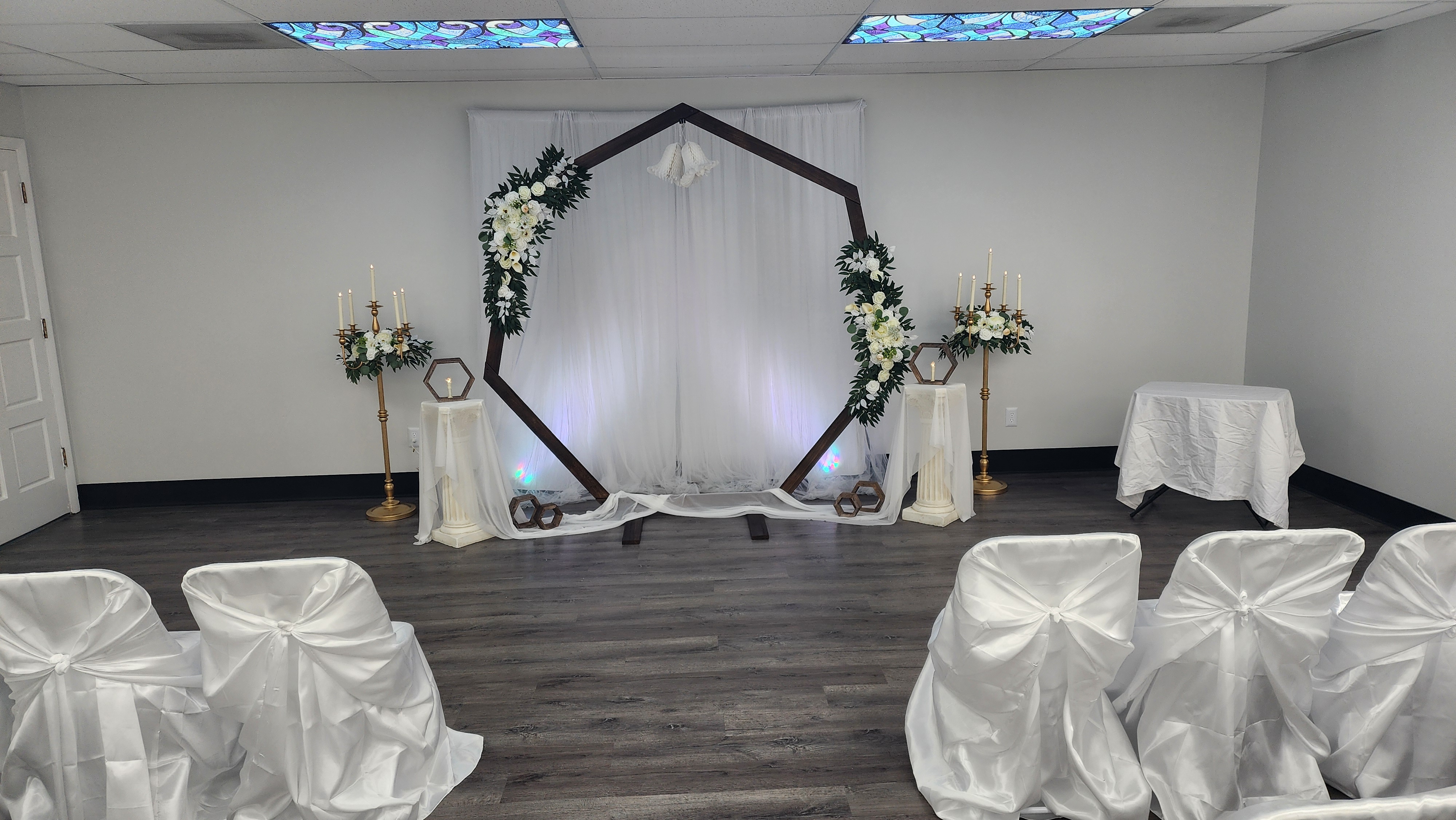 If your in need of a location for just your wedding ceremony, then we have what you need. With our Intimate wedding chapel you can bring your own small radio for music and flowers or other decor as long as you remove it after the event. Our Intimate wedding chapel has seating for up to 20 guests. All religions welcome or those without any religion. Our wedding chapel's have no religious items and can be used by all.